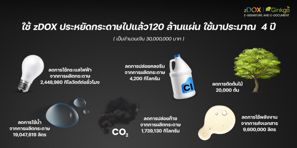 ในยุคที่เราต้องเผชิญกับปัญหาสิ่งแวดล้อม การลดการใช้กระดาษถือเป็นหนึ่งในวิธีที่สำคัญในการอนุรักษ์ทรัพยากรธรรมชาติ zDOX เป็นเครื่องมือที่ช่วยให้ผู้ใช้งานสามารถเซ็นและจัดการเอกสารต่าง ๆ ได้อย่างสะดวกและรวดเร็ว โดยไม่ต้องใช้กระดาษ ซึ่งช่วยลดการปล่อยก๊าซคาร์บอนจากการผลิตกระดาษและการขนส่ง นอกจากนี้ การใช้แอปเซ็นเอกสารยังช่วยเพิ่มประสิทธิภาพในการทำงาน ลดเวลาในการดำเนินการ และสร้างความยั่งยืนให้กับโลกของเราในระยะยาว ผ่านการใช้เทคโนโลยีที่เป็นมิตรกับสิ่งแวดล้อม เราสามารถร่วมมือกันในการสร้างอนาคตที่ดีกว่า โดยเริ่มต้นจากการเปลี่ยนแปลงในวิธีการทำงานของเราเอง ปัจจุบันผู้คนเปลี่ยนพฤติกรรมการใช้กระดาษ ให้ทันสมัยมากขึ้น zDOX จึงมีผลสรุปยอดการใช้กระดาษของลูกค้าทั้งหมด ในระยะเวลา 4 ปี ดังภาพนี้